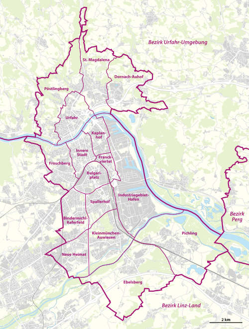 Linz grenzt im Norden und Osten, durchwegs links der Donau, an sieben Gemeinden des Bezirks Urfahr-Umgebung (UU), im Süden und Westen an fünf Gemeinden des Bezirks Linz-Land (LL), und im Südosten, in einem kurzen Abschnitt ebenfalls links der Donau, an eine Gemeinde des Bezirks Perg (PE).