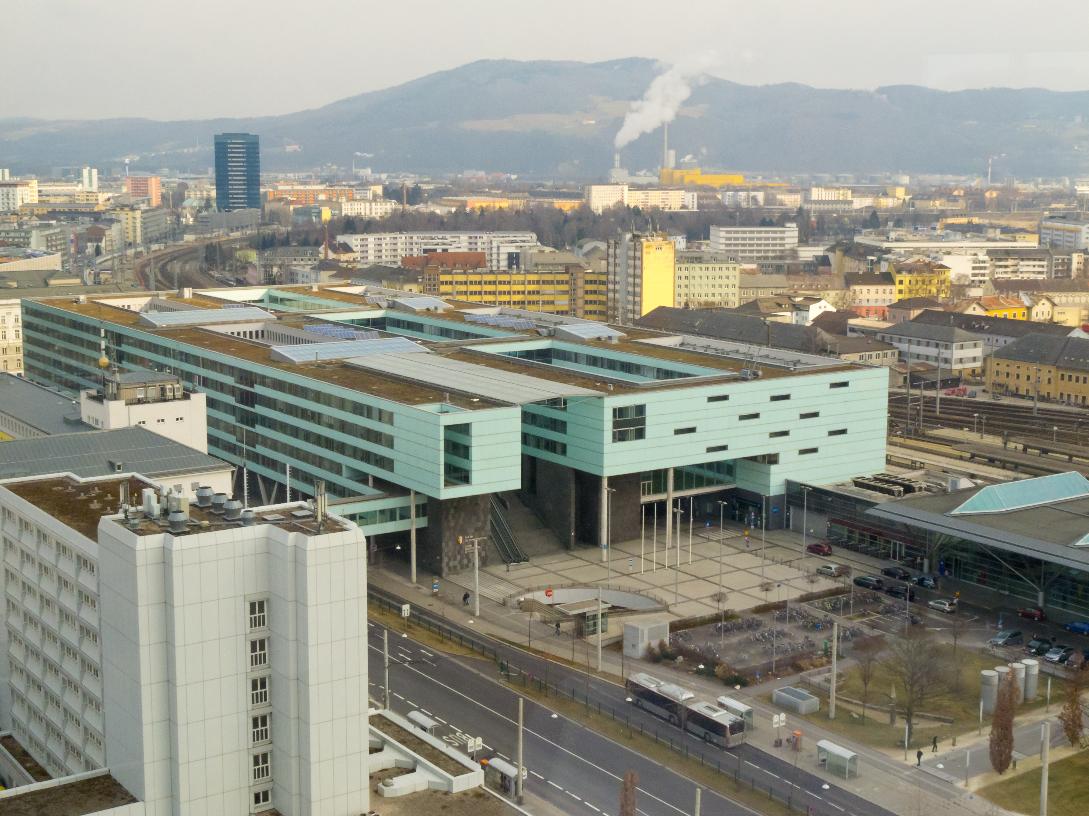 | Beschreibung: | Landesdienstleistungszentrum neben dem Hauptbahnhof Linz fotografiert vom Wissensturm aus. |