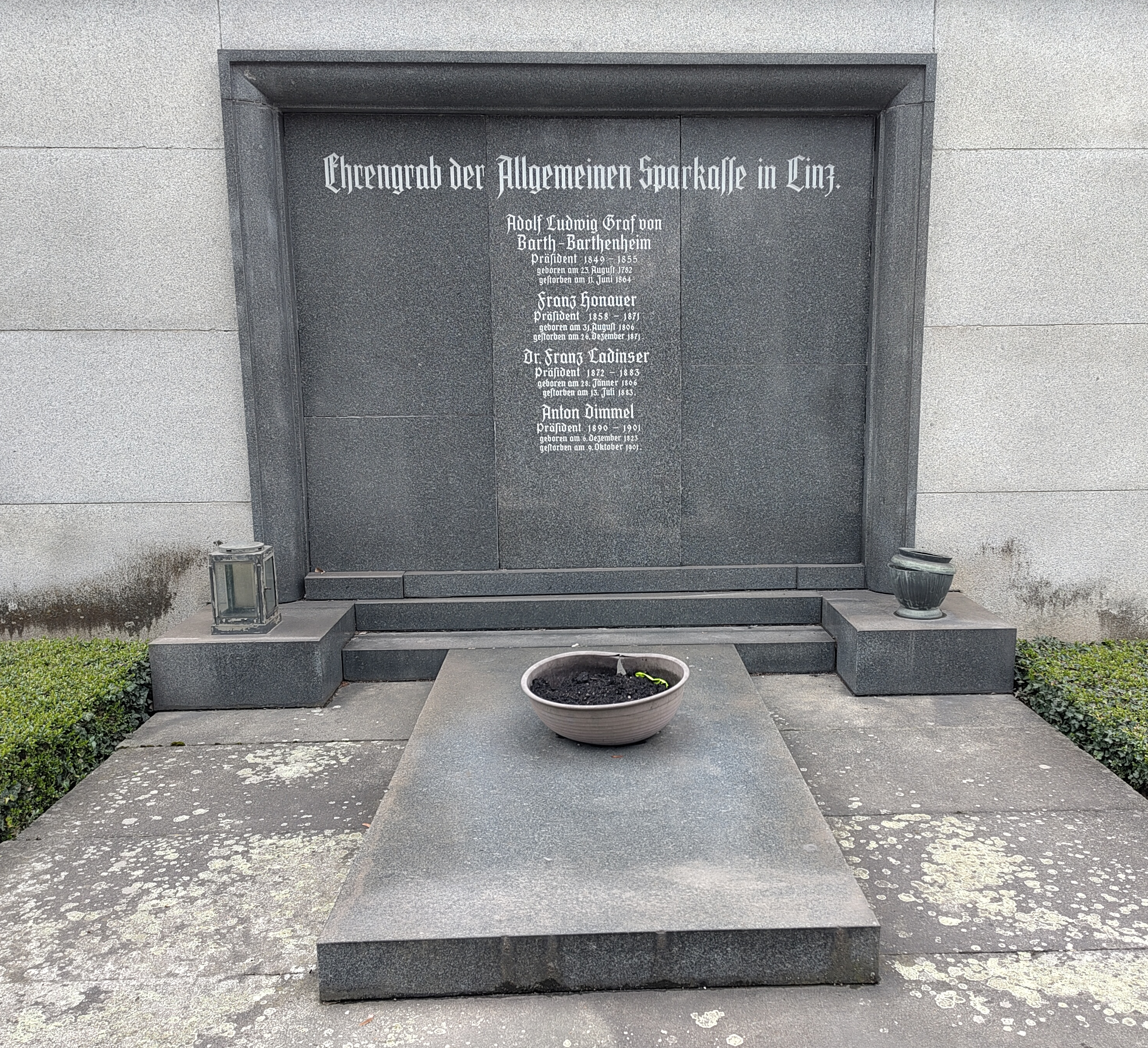 | 10:28, 17. Aug. 2025 | Ehrengrab Allgemeine Sparkasse.jpg (Datei) | 3,71 MB | {{Infobox Foto |Name = Ehrengrab der Allgemeinen Sparkasse |Beschreibung = Ehrengrab der Allgemeinen Sparkasse Oberösterreich, am Barbarafriedhof. Begraben sind hier Adolf Ludwig Graf von Barth-Barthenheim, Franz Honauer, Franz Ladinser, Anton Dimmel |Urheber = Christian Wirth (Benutzer:Wirthi) |Datum = |Ort = Barbarafriedhof |Lizenz = {{C… | 1 | |